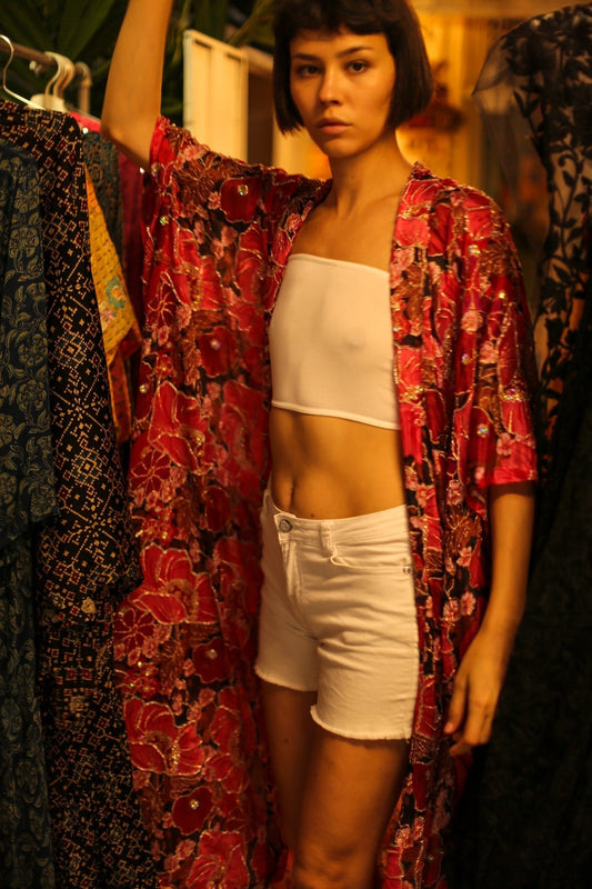 WIDE LEG BLOCK PRINT SILK PANTS RUBY