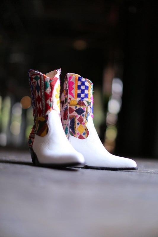 WHITE LEATHER / EMBROIDERED PATCHWORK DETAIL BOOTS DONNA