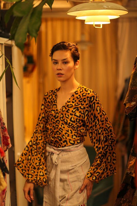 SILK WRAP TOP AURELIA DARK YELLOW LEOPARD