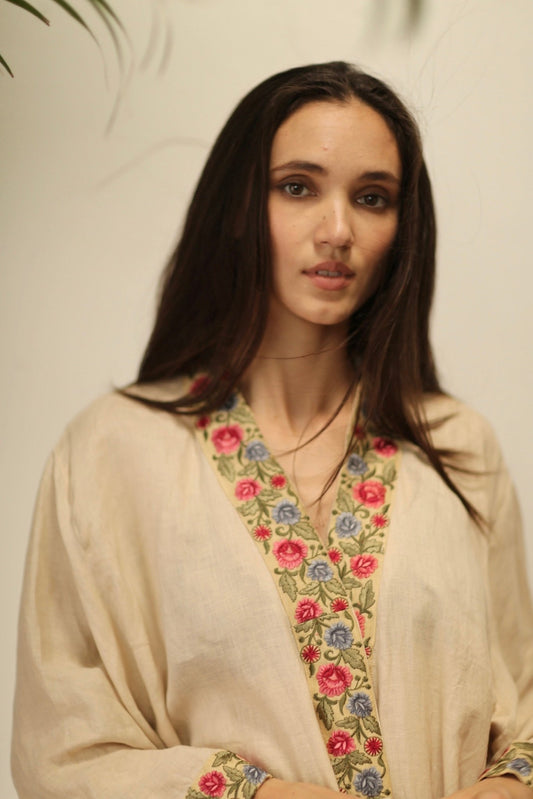 THE PREMIUM LINEN EMBROIDERED SILK TRIM KIMONO