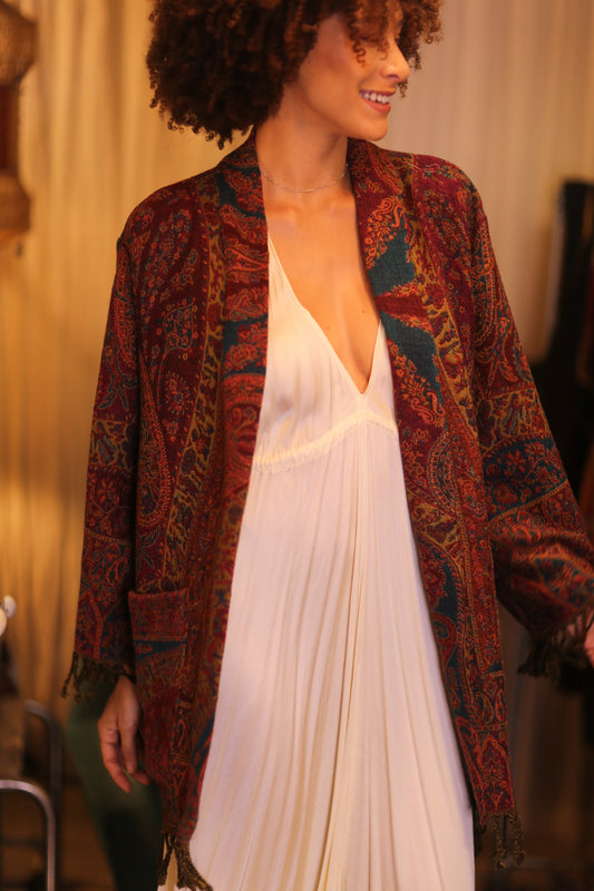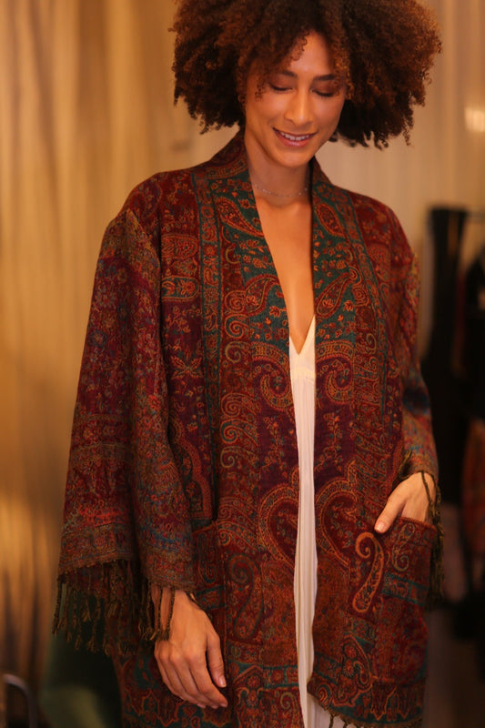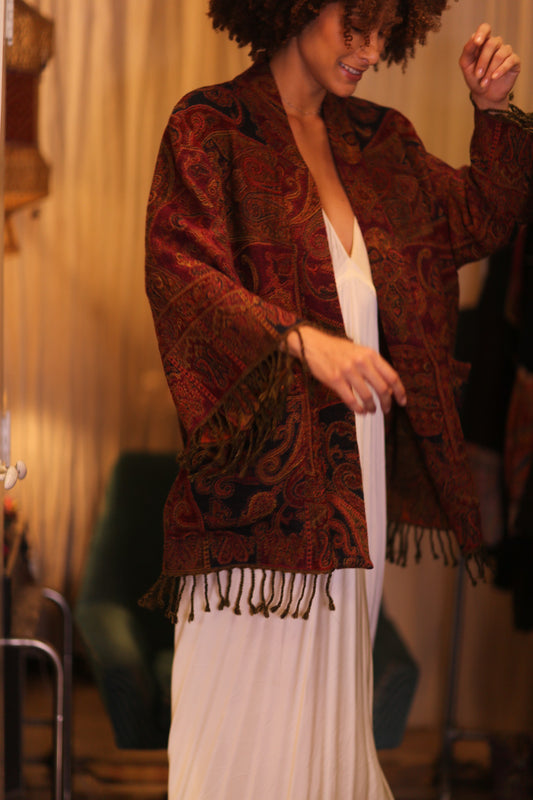 CONE PATTERNED EMBROIDERED COTTON WOOL SHAWL KIMONO NANCY
