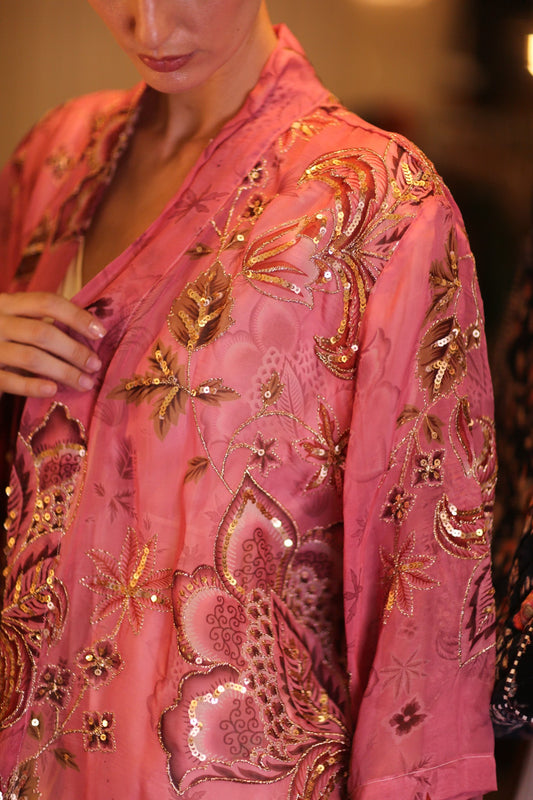 EMBROIDERED PINK SILK SHORT KIMONO PINTRA
