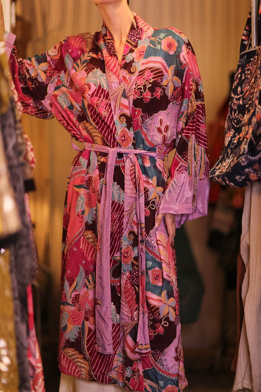 MAGENTA EMBROIDERED VELVET SHORT KIMONO VELOUR